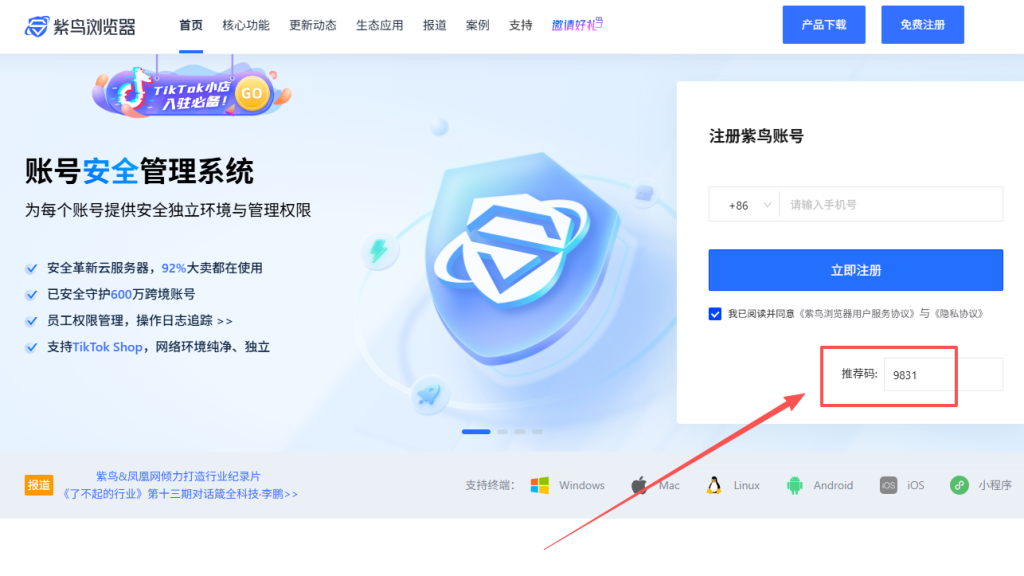 第2步,注册紫鸟浏览器账号,记得填写推荐码9831,有139元优惠券。