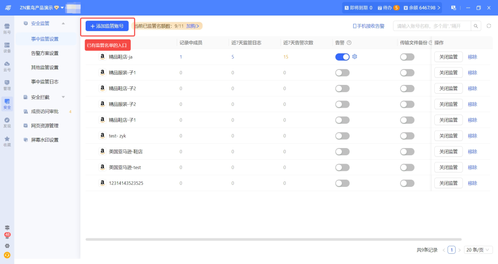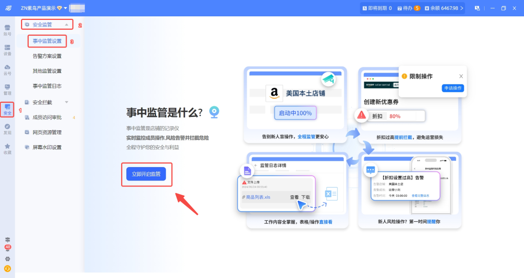 设置入口统一为:安全模块→事中监管管理→选择“监管账号设置”或“监管成员设置”→添加对应账号/成员。免费版企业可体验1次“1个店铺/24小时”的监管,升级安全管家后可获得10个监管名额,支持按成员监管时不限店铺数量、按账号监管时不限成员数量。